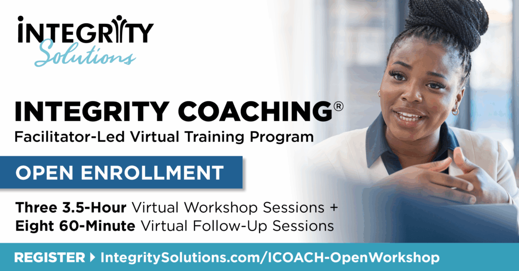 Integrity Coaching Open Enrollment Workshop Our open enrollment version of Integrity Coaching® allows individuals and small teams to fully experience our industry-leading leadership development training. The upcoming schedule for Integrity Coaching Open Enrollment is available! Register at the form below, and select your desired date. *Live virtual workshop sessions typically run 10:00am – 1:30pm Eastern Time. Sustainment sessions are scheduled based on learner availability. Name(Required) First Last Session Date(Required)February 24-26, 2026June 9-11, 2026September 1-3, 2026Company Name(Required)Country / Region(Required)United States (US)AfghanistanAlbaniaAlgeriaAmerican SamoaAndorraAngolaAnguillaAntarcticaAntigua and BarbudaArgentinaArmeniaArubaAustraliaAustriaAzerbaijanBahamasBahrainBangladeshBarbadosBelarusBelgiumBelizeBeninBermudaBhutanBoliviaBonaire, Sint Eustatius and SabaBosnia and HerzegovinaBotswanaBouvet IslandBrazilBritish Indian Ocean TerritoryBrunei DarussalamBulgariaBurkina FasoBurundiCambodiaCameroonCanadaCape VerdeCayman IslandsCentral African RepublicChadChileChinaChristmas IslandCocos IslandsColombiaComorosCongo, Democratic Republic of theCongo, Republic of theCook IslandsCosta RicaCroatiaCubaCuraçaoCyprusCzech RepublicCôte d'IvoireDenmarkDjiboutiDominicaDominican RepublicEcuadorEgyptEl SalvadorEquatorial GuineaEritreaEstoniaEswatini (Swaziland)EthiopiaFalkland IslandsFaroe IslandsFijiFinlandFranceFrench GuianaFrench PolynesiaFrench Southern TerritoriesGabonGambiaGeorgiaGermanyGhanaGibraltarGreeceGreenlandGrenadaGuadeloupeGuamGuatemalaGuernseyGuineaGuinea-BissauGuyanaHaitiHeard and McDonald IslandsHoly SeeHondurasHong KongHungaryIcelandIndiaIndonesiaIranIraqIrelandIsle of ManIsraelItalyJamaicaJapanJerseyJordanKazakhstanKenyaKiribatiKuwaitKyrgyzstanLao People's Democratic RepublicLatviaLebanonLesothoLiberiaLibyaLiechtensteinLithuaniaLuxembourgMacauMacedoniaMadagascarMalawiMalaysiaMaldivesMaliMaltaMarshall IslandsMartiniqueMauritaniaMauritiusMayotteMexicoMicronesiaMoldovaMonacoMongoliaMontenegroMontserratMoroccoMozambiqueMyanmarNamibiaNauruNepalNetherlandsNew CaledoniaNew ZealandNicaraguaNigerNigeriaNiueNorfolk IslandNorth KoreaNorthern Mariana IslandsNorwayOmanPakistanPalauPalestine, State ofPanamaPapua New GuineaParaguayPeruPhilippinesPitcairnPolandPortugalPuerto RicoQatarRomaniaRussiaRwandaRéunionSaint BarthélemySaint HelenaSaint Kitts and NevisSaint LuciaSaint MartinSaint Pierre and MiquelonSaint Vincent and the GrenadinesSamoaSan MarinoSao Tome and PrincipeSaudi ArabiaSenegalSerbiaSeychellesSierra LeoneSingaporeSint MaartenSlovakiaSloveniaSolomon IslandsSomaliaSouth AfricaSouth GeorgiaSouth KoreaSouth SudanSpainSri LankaSudanSurinameSvalbard and Jan Mayen IslandsSwedenSwitzerlandSyriaTaiwanTajikistanTanzaniaThailandTimor-LesteTogoTokelauTongaTrinidad and TobagoTunisiaTurkeyTurkmenistanTurks and Caicos IslandsTuvaluUS Minor Outlying IslandsUgandaUkraineUnited Arab EmiratesUnited KingdomUruguayUzbekistanVanuatuVenezuelaVietnamVirgin Islands, BritishVirgin Islands, U.S.Wallis and FutunaWestern SaharaYemenZambiaZimbabweÅland IslandsAddress(Required) House Number and street name Apartment, suite, unit, etc Town / City State / Province / Region ZIP / Postal Code Phone(Required)Email(Required) Registration NotesNotes about your registration.Integrity Coaching Open Enrollment Quantity Price: $1,950.00 Quantity Coupon Total Credit Card American ExpressDiscoverMasterCardVisaSupported Credit Cards: American Express, Discover, MasterCard, Visa Card Number Expiration Date Month Month010203040506070809101112 Year Year20262027202820292030203120322033203420352036203720382039204020412042204320442045 Security Code Cardholder Name Integrity Coaching® enables managers to rise up and lead to maximize the potential of every member of your team. Your employees will see more in themselves, and your senior leaders will recast what they believe their roles to be, delegating more and freeing up time for strategic priorities. Integrity Coaching® equips your leaders with the SKILL SET to coach and the MINDSET to make coaching a natural, consistent habit. Integrity Coaching® will change mindsets in your organization and instill new leadership behaviors, grounded in the belief that a leader’s first priority is to coach the next tier of leadership, engage people in the mission, build the confidence and commitment to strive for more, and create sustained learning cultures. This course consists of three 3.5 hour live virtual workshop sessions, and 8 follow-up sessions Cost is $1,950/person. Discounts for this leadership development training workshop are available for groups of 3 or more from the same organization. Spaced is limited. Any questions? Email Emily Stacey. Advanced registration deadline is one week ahead of each start date. Registrations received after that date are subject to an additional $100 rush processing fee per person. *Live virtual workshop sessions typically run 10:00am – 1:30pm Eastern Time. Sustainment sessions are scheduled based on learner availability. “When we were introduced to Integrity Coaching® it was clear that our people and our business would benefit if we could integrate ‘coaching’ into our culture. The decision to work with Integrity was easy because they provide leadership development that matches our culture and our needs.” Open Enrollment and Certification Workshop PolicyAt Integrity Solutions, we are committed to delivering a high-quality, engaging, and seamless workshop experience. To support our learners and ensure consistent standards, the following policies apply to all Open Enrollment and Certification Workshops. Workshop Scheduling: Schedules dates for all Open Enrollment and Certification Workshops will be published at least six (6) months in advance. This scheduling cadence allows learners and sponsoring organizations sufficient time to plan participation and travel, if applicable. Minimum Enrollment Requirement: Each workshop 