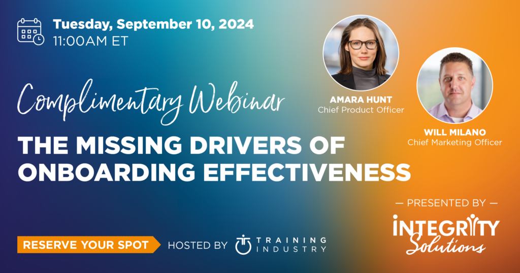 The Missing Drivers of Onboarding Effectiveness Sep 10, 2024 WEBINAR in partnership with Training Industry, Inc. Reserve your spot! The onboarding experience can have a significant impact on engagement, productivity, retention and the ability to integrate new people into the team and culture. This is a critical opportunity to get employees off to a positive start, yet many organizations aren’t getting the most value out of it — or their employees. Most new hire onboarding tends to focus primarily on policy, systems and processes, products and services, and other operational areas. The “what” of how to conduct business may be well covered, but often the “why” is missing. That “why” is essential for creating a sense of emotional connection to the organization that goes beyond the mechanics of the job and the department, and requires more than a simple slide outlining organizational vision. Join us Tuesday, September 10th for this complimentary webinar, in partnership with TrainingIndustry.com. Your co-hosts, Amara Hunt, chief product officer, and Will Milano, chief marketing officer, will unpack the often overlooked, yet essential, aspects of essential onboarding programs and why the key to sustained performance, employee engagement and retention goes well beyond just the basic how-to’s of navigating the organization. This interactive webinar will explore and provide actionable insights on: The key performance driver that must be addressed early in the employee experience — and that most onboarding overlooks. The mixture of mindset, skill set and practice necessary for inspiring new employee confidence, competence and motivation. How to use onboarding to help employees find “congruence,” that alignment of values, beliefs, commitment and purpose that fuels job success and fulfillment. Methodologies that create communication norms and language around how business gets done. Reserve your spot today!