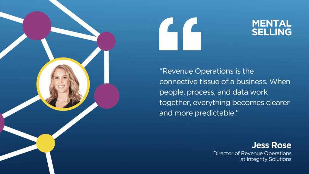 / Resources Elevating Sales Outcomes through Rev Ops Excellence with Jess Rose Guest: Jess Rose Revenue Operations is one of the most strategic drivers of growth, even if many organizations only notice it when something breaks. Jess Rose, the newly hired Director of Revenue Operations at Integrity Solutions, joins Mental Selling to emphasize a discipline that many organizations undervalue but rely on every single day. In her first weeks with the company, she is already bringing clarity to the systems, processes, and decisions that fuel predictable performance. Jess explains why Rev Ops is the connective tissue across sales, marketing, and customer success, and why clean data, transparent processes, and human-centered systems create the conditions for scalable growth. She shares lessons from her career leading operational strategy, including how minor workflow adjustments can create meaningful lift, why sellers need clarity rather than more noise, and how human habits can either strengthen or derail even the best-designed systems. Listeners will gain a grounded view of how Rev Ops strengthens alignment, improves decision-making, and creates the conditions for consistent, confident performance. Listen Now Amazon More Options Your Host Hayley Parr Head of Marketing, Integrity Solutions In this Mental Selling episode, you’ll learn: Operational Excellence Starts with the Basics: Clean data, clear ownership, and simple enablement power confident, consistent performance. Process as a Growth Lever: Standardized stages and documented workflows create a shared path that drives predictable results. Technology That Works for People: Tools designed with a human-first lens remove friction and help reps stay focused on selling. Adoption Through Trust: Teams commit to operational change when the process feels supportive, transparent, and genuinely helpful. Jump into the conversation: (00:00) Meet Jess Rose (02:31) What revenue operations really means (04:42) Jess’s path into Rev Ops (06:39) Misconceptions that hold teams back (08:40) Why data hygiene influences revenue health (11:37) Simple fixes that create measurable impact to the bottom line (16:21) The human habits behind operational success (22:01) Building trust across sales, marketing, and customer success Additional Resources From This Episode: Jess Rose’s LinkedIn: https://www.linkedin.com/in/jessica-rose-2b482122/ Learn more about Integrity Solutions: https://www.integritysolutions.com/ Raise your Mental Selling acumen with us by following us on Apple Podcasts, Spotify, iHeartRadio, Amazon, GoodPods or wherever you get your podcasts. Please rate our show or leave a review— we value YOUR feedback! Salesforce, Cognism, FeedSpot and others have all named us as one of the best sales podcasts for your playlist. And Training Industry, Inc. includes us on their Ultimate L&D Podcast Guide. Share This Post: Related Episodes Getting Buyers to Buy When They’ve Already Made Up Their Minds Guest: Em Holldorf In this Mental Selling episode, you’ll learn: Jump into the conversation: Additional Resources From This Episode: Raise your Mental Selling… EP. 126 January 16, 2026 28:14 A Year of Lessons with Mental Selling in 2025 Host: Hayley Parr In this Mental Selling episode, you’ll learn: Jump into the conversation: Additional Resources From This Episode: Raise your Mental Selling… EP. 125 December 31, 2025 18:40 Building Unbreakable Sales Momentum with Shawn Young Guest: Shawn Young In this Mental Selling episode, you’ll learn: Jump into the conversation: Additional Resources From This Episode: Raise your Mental Selling… EP. 123 December 1, 2025 19:39 Leading Through the Whirlwind with David Hammond Guest: David Hammond In this Mental Selling episode, you’ll learn: Jump into the conversation: Additional Resources From This Episode: Raise your Mental Selling… EP. 122 November 13, 2025 16:45